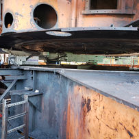 No caso de equipamentos com sistema de giro com truques, realizamos a usinagem do diâmetro interno de apoio do trilho onde passam os rolos que garantem a centragem da parte superior do equipamento.
